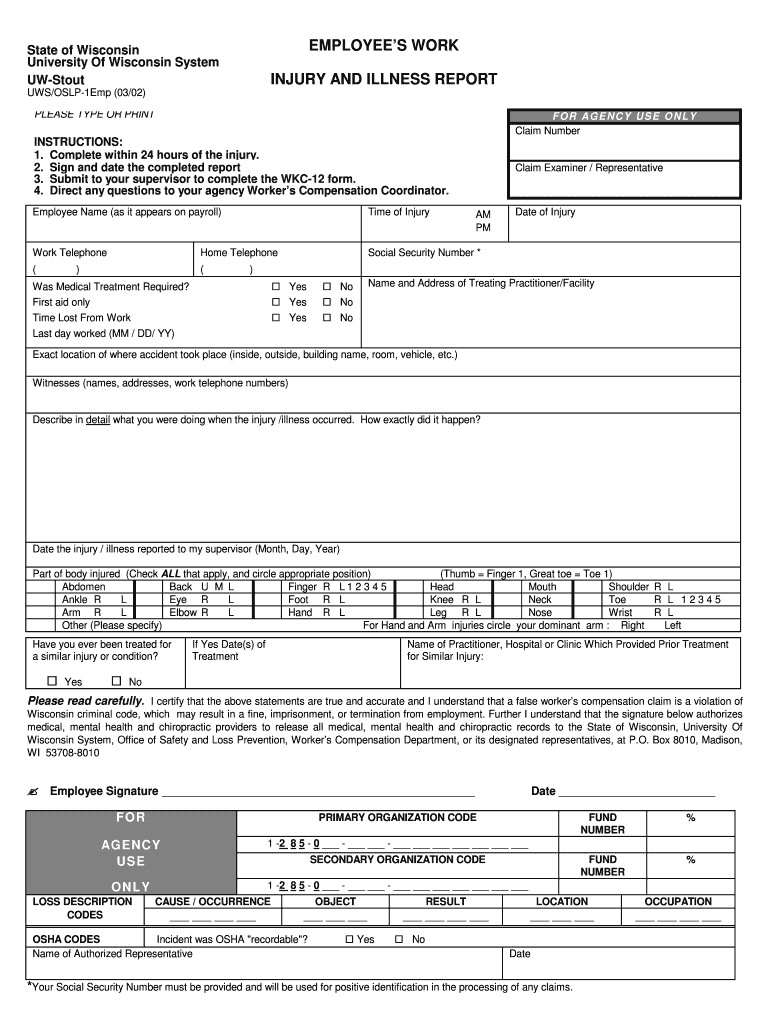 EMPLOYEES WORK State of Wisconsin University Of Wisconsin System Stout Clear Form INJURY AND ILLNESS REPORT US/OSLP1Emp (03/02) PLEASE TYPE OR PRINT FOR AGENCY USE ONLY Claim Number INSTRUCTIONS: