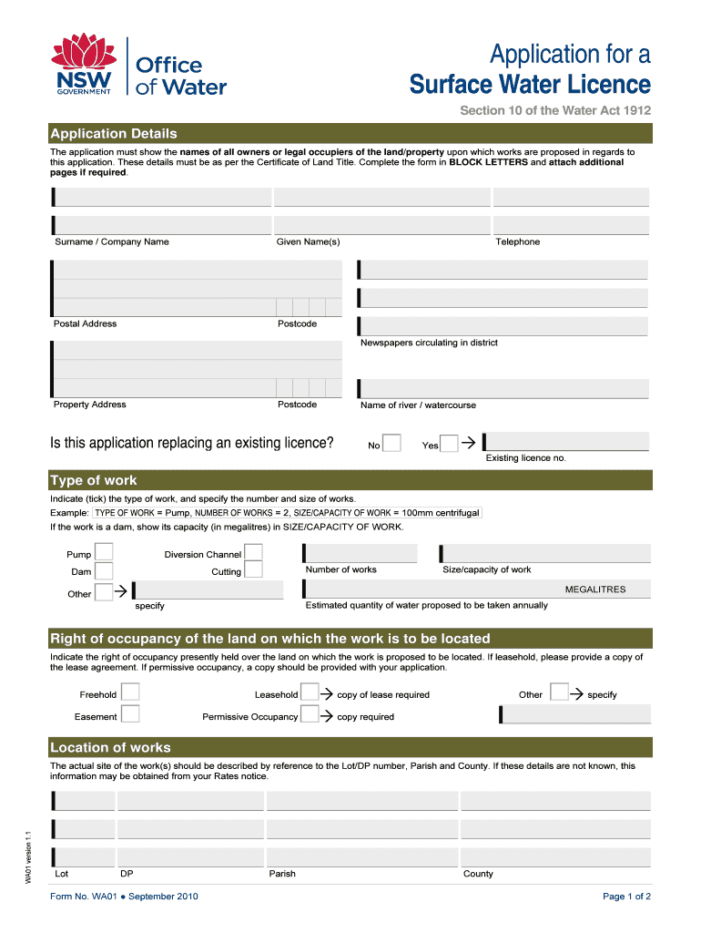Application for a Surface Water License Section 10 of the Water Act 1912 Application Details The application must show the names of all owners or legal occupiers of the land/property upon which works