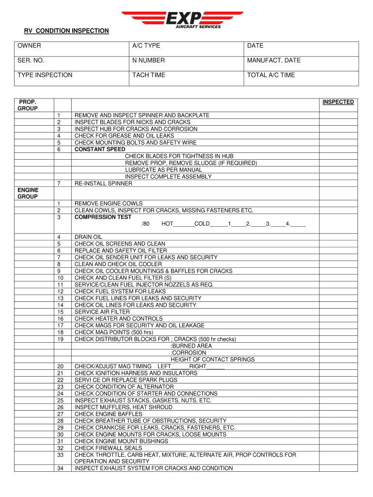 RV CONDITION INSPECTION OWNER A/C TYPE DATE SER. NO. N NUMBER MANUAL. DATE TYPE INSPECTION EACH TIME TOTAL A/C TIME PROP. GROUP INSPECTED 1 2 3 4 5 6 7 REMOVE AND INSPECT SPINNER AND BACKPLATE INSPECT