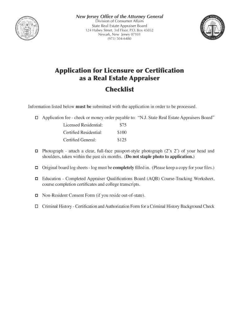 New Jersey Office of the Attorney General Division of Consumer Affairs State Real Estate Appraiser Board 124 Halsey Street, 3rd Floor, P.O. Box 45032 Newark, New Jersey 07101 (973) 5046480 Application