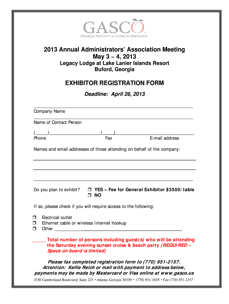 2013 Annual Administrators Association Meeting May 3 4, 2013 Legacy Lodge at Lake Lanier Islands Resort Buford, Georgia EXHIBITOR REGISTRATION FORM Deadline: April 26, 2013, Company Name of Contact