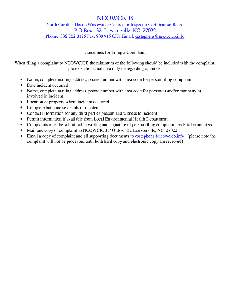 Note: The specific requirements for filing a complaint may vary depending on the jurisdiction and the nature of the complaint. It is advisable to consult the NCOWCICB website or seek legal advice if you have any questions or concerns about the process.