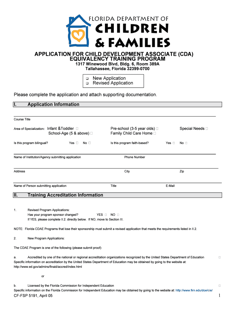 APPLICATION FOR CHILD DEVELOPMENT ASSOCIATE (CDA) EQUIVALENCY TRAINING PROGRAM 1317 Pinewood Blvd, Bldg. 6, Room 389A Tallahassee, Florida 323990700 New Application Revised Application Please complete