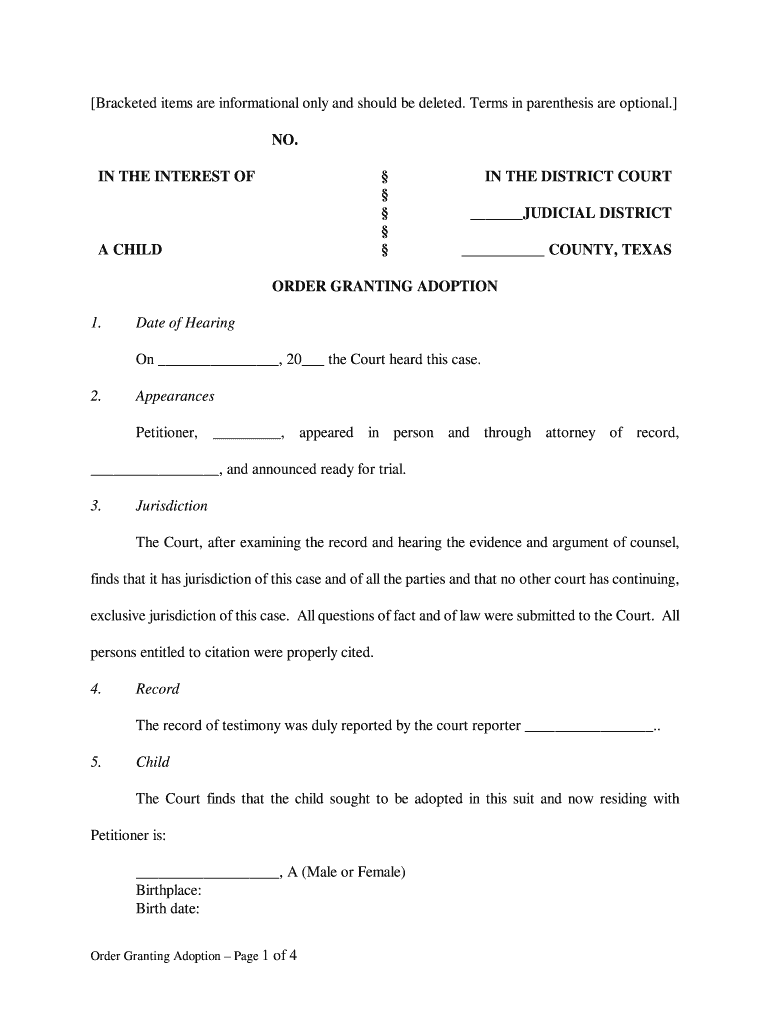Bracketed items are informational only and should be deleted. Terms in parentheses are optional. NO. IN THE INTEREST OF A CHILD IN THE DISTRICT COURT JUDICIAL DISTRICT COUNTY, TEXAS ORDER GRANTING