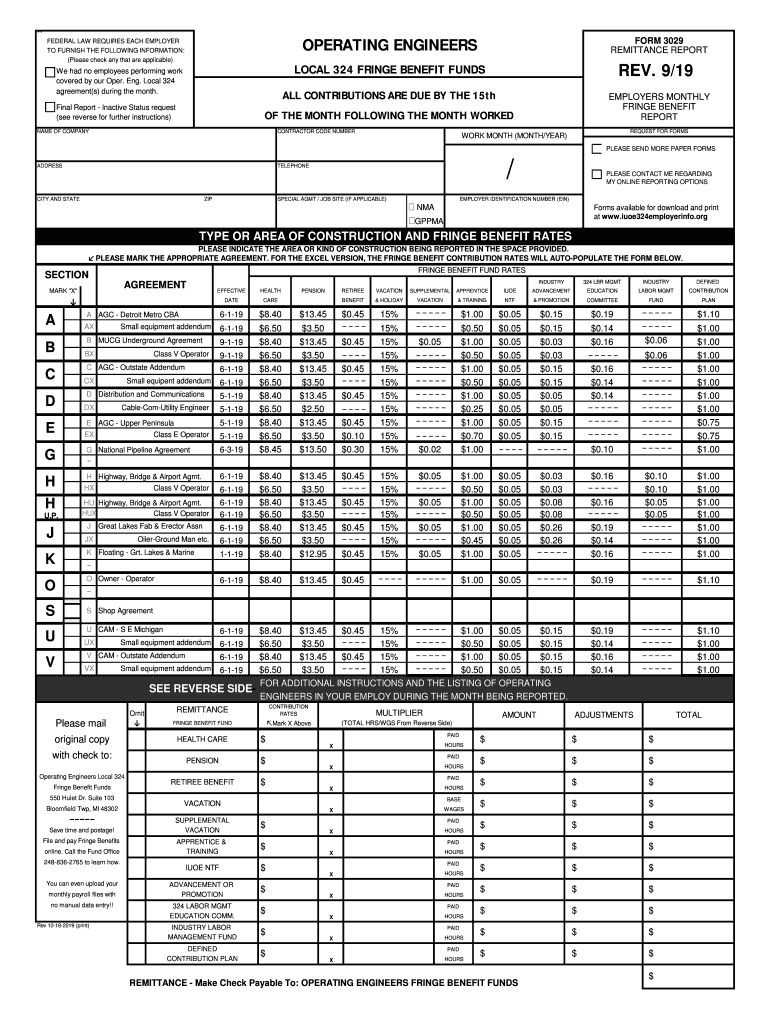 Operating ENGINEERSFEDERAL LAW REQUIRES EACH EMPLOYER TO FURNISH THE FOLLOWING INFORMATION: (Please check any that are applicable)FORM 3029 REMITTANCE REPORTORIAL 324 FRINGE BENEFIT Funds had no employees