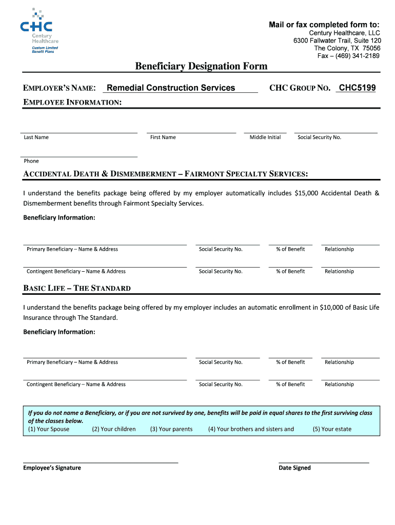 Mail or fax completed form to: Century Healthcare, LLC 6300 Fall water Trail, Suite 120 The Colony, TX 75056 Fax (469) 3412189 Beneficiary Designation Form EMPLOYERS NAME: Remedial Construction Services