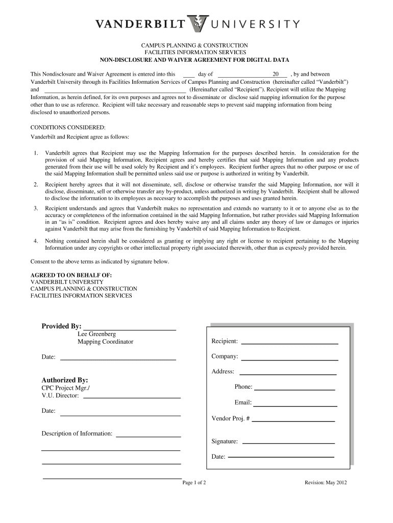 CAMPUS PLANNING & CONSTRUCTION FACILITIES INFORMATION SERVICES NONDISCLOSURE AND WAIVER AGREEMENT FOR DIGITAL DATA This Nondisclosure and Waiver Agreement is entered into this day of 20, by and between