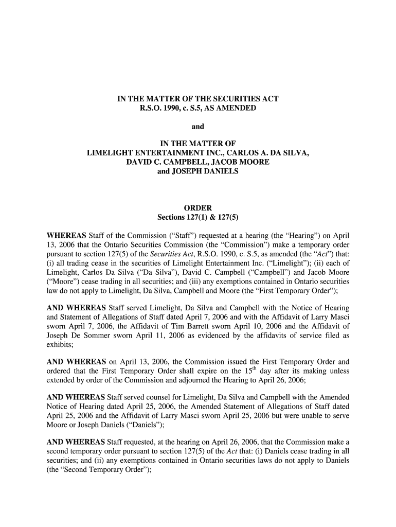 IN THE MATTER OF THE SECURITIES ACT R.S.O. 1990, c. S.5, AS AMENDED and IN THE MATTER OF LIMELIGHT ENTERTAINMENT INC., CARLOS A. DA SILVA, DAVID C. CAMPBELL, JACOB MOORE and JOSEPH DANIELS ORDER Sections