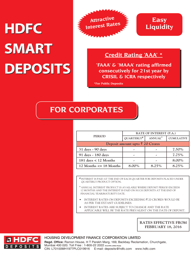HDFC SMART DEPOSITS Attractive dates Interest R Easy Liquidity Credit Rating AAA * AAA & MAYA rating affirmed consecutively for 21st year by CRISIS & ICRA respectively *For Public Deposits FOR CORPORATES