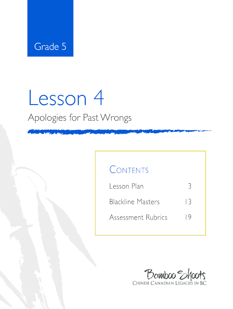 Grade 5 Lesson 4 Apologies for Past Wrongs Contents Lesson Plan 3 Black line Masters 13 Assessment Rubrics 19 Acknowledgements & Copyright 2015 Province of British Columbia This resource was developed