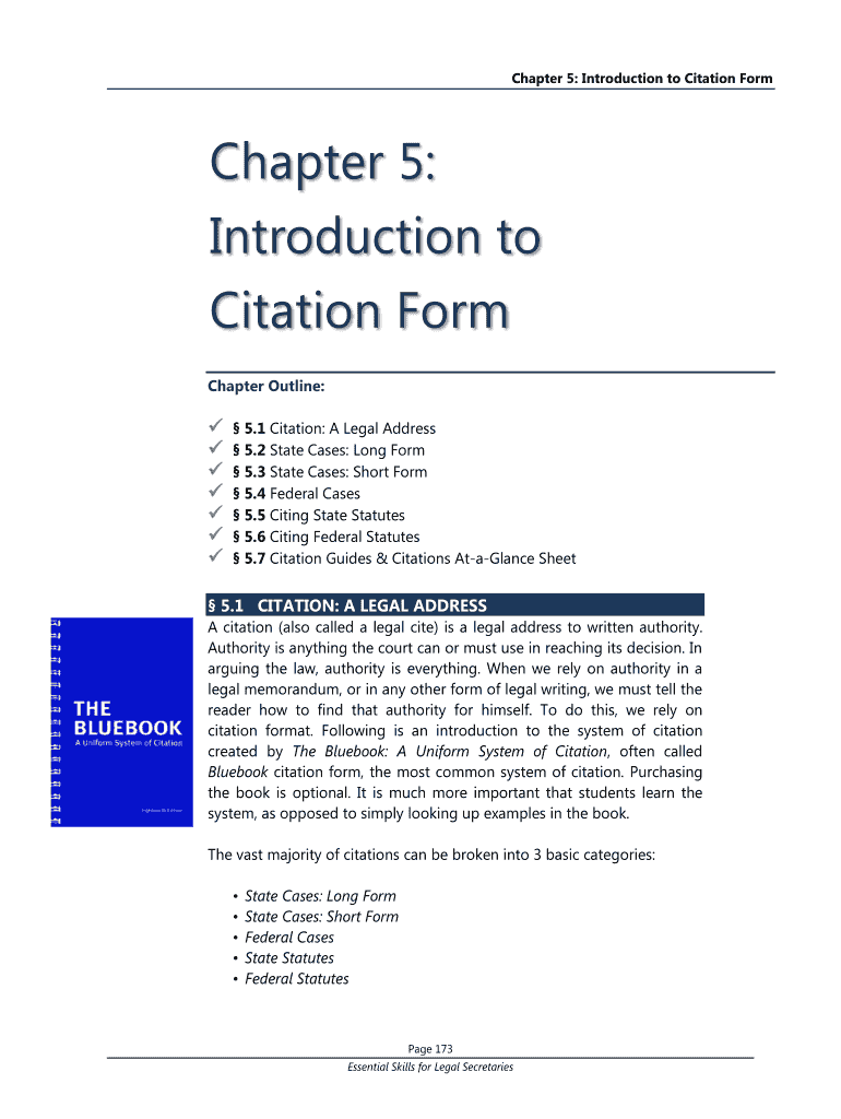 Chapter 5: Introduction to Citation Form Chapter 5: Introduction to Citation Form Chapter Outline: 5.1 Citation: A Legal Address 5.2 State Cases: Long Form 5.3 State Cases: Short Form 5.4 Federal