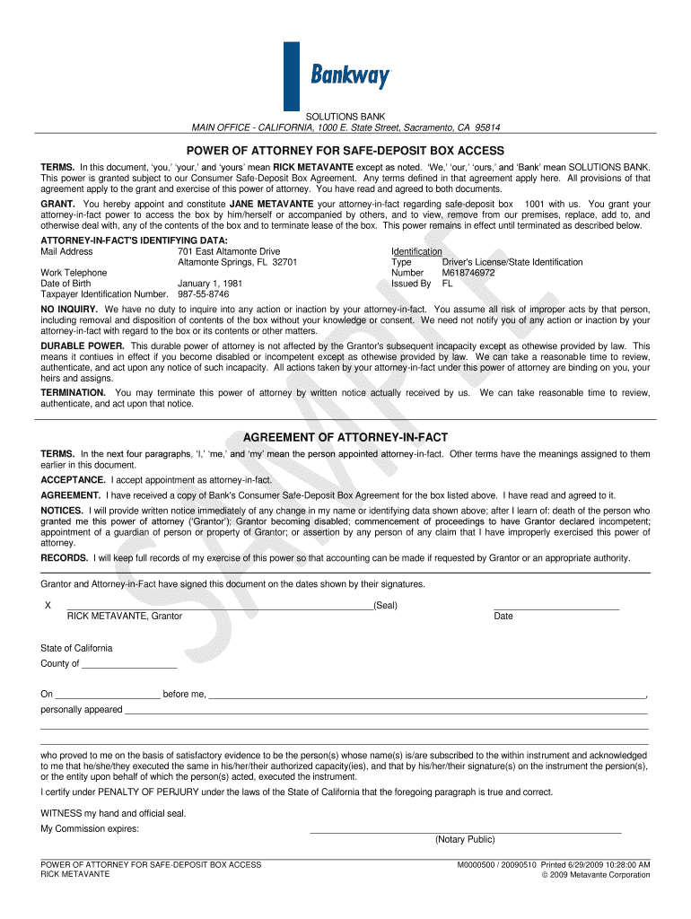 SOLUTIONS BANK MAIN OFFICE CALIFORNIA, 1000 E. State Street, Sacramento, CA 95814 POWER OF ATTORNEY FOR REDEPOSIT BOX ACCESS TERMS. In this document, you, your, and yours mean RICK METHANE except