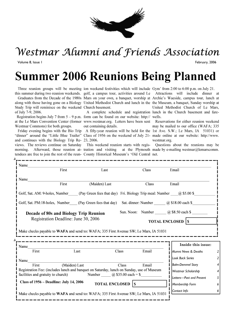 West mar Alumni and Friends Association Volume 8, Issue 1 February 2006 Summer 2006 Reunions Being Planned Three reunion groups will be meeting this summer during two reunion weekends. Graduates from
