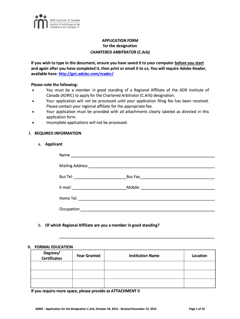 APPLICATION FORM for the designation CHARTERED ARBITRATOR (C. ARB) If you wish to type in the document, ensure you have saved it to your computer before you start and again after you have completed