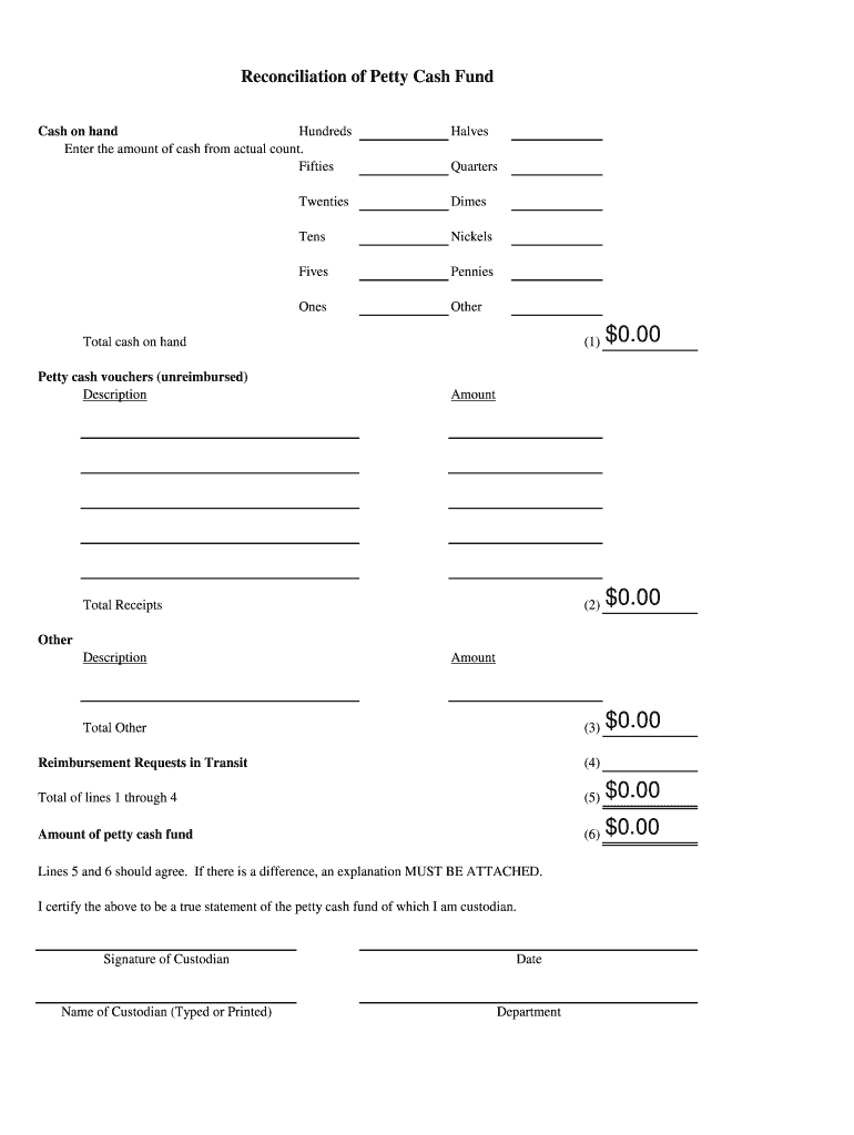 Reconciliation of Petty Cash Fund Cash on hand Hundreds Enter the amount of cash from actual count. Fifty Halves Twenties Dimes Tens Nickels Fives Pennies One's Other Quarters (1) Petty cash vouchers