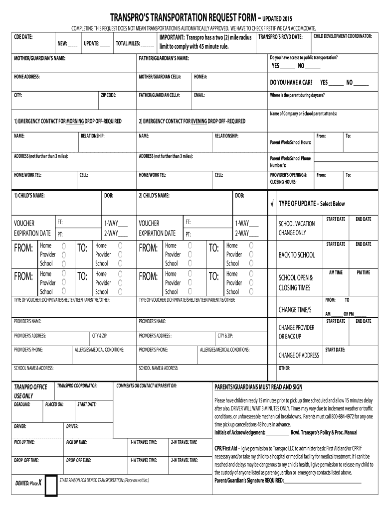 TRANSPORTS TRANSPORTATION REQUEST FORM UPDATED 2015 RESET PRINT/SAVE COMPLETING THIS REQUEST DOES NOT MEAN TRANSPORTATION IS AUTOMATICALLY APPROVED. WE HAVE TO CHECK FIRST IF WE CAN ACCOMMODATE. CHILD