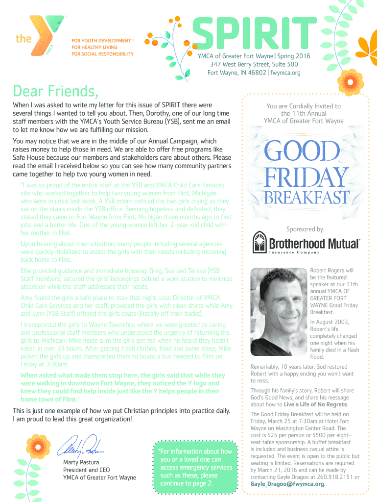 SPIRIT YMCA of Greater Fort Wayne Spring 2016 347 West Berry Street, Suite 500 Fort Wayne, IN 46802 YMCA.order Friends, When I was asked to write my letter for this issue of SPIRIT there were several