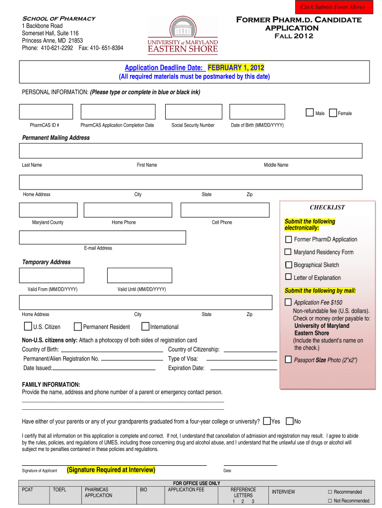 Click Submit Form Above School of Pharmacy FORMER HARM. D. CANDIDATE 1 Backbone Road Somerset Hall, Suite 116 Princess Anne, MD 21853 Phone: 4106212292 Fax: 410 6518394 APPLICATION Fall 2012 Application