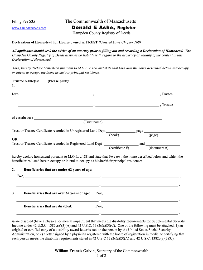 Get the free Declaration of Homestead - 2nd Revised - TRUST - July 2012doc - registryofdeeds co h...