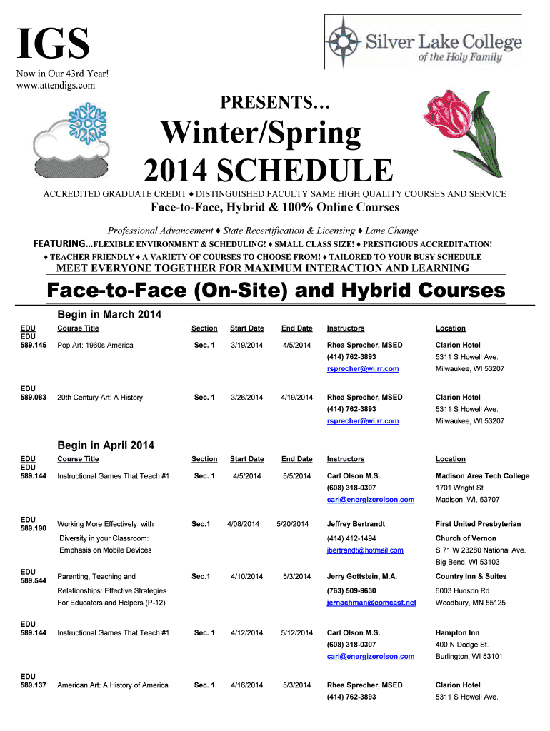 IGS Now in Our 43rd Year! www.attendigs.com PRESENTS Winter/Spring 2014 SCHEDULE ACCREDITED GRADUATE CREDIT DISTINGUISHED FACULTY SAME HIGH QUALITY COURSES AND SERVICE FacetoFace, Hybrid & 100% Online