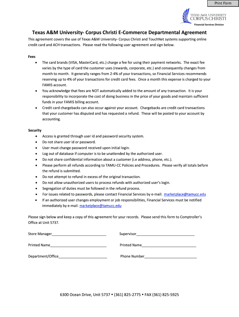 Print Form FinancialServicesDivision TexasA&MUniversityCorpusChristiECommerceDepartmentalAgreement ThisagreementcoverstheuseofTexasA&MUniversityCorpusChristiandTouchNetsystemssupportingonline creditcardandACHtransactions.