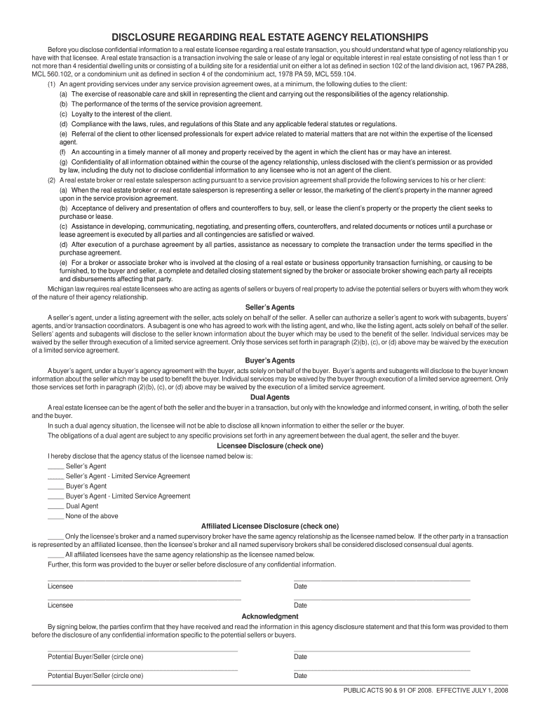 Get the free Michigan Real Estate Agency Disclosure Form
