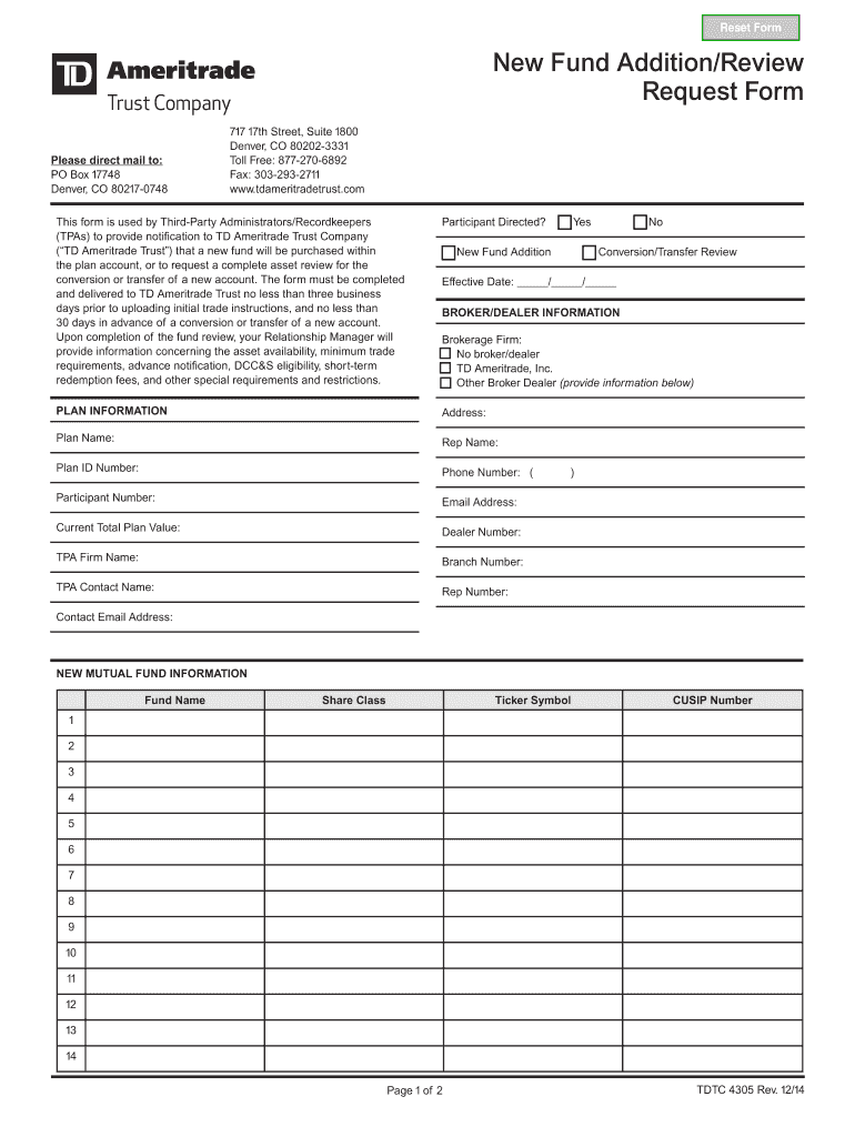 Reset Form New Fund Addition/Review Request Form Please direct mail to: PO Box 17748 Denver, CO 802170748 717 17th Street, Suite 1800 Denver, CO 802023331 Toll Free: 8772706892 Fax: 3032932711 www.tdameritradetrust.com