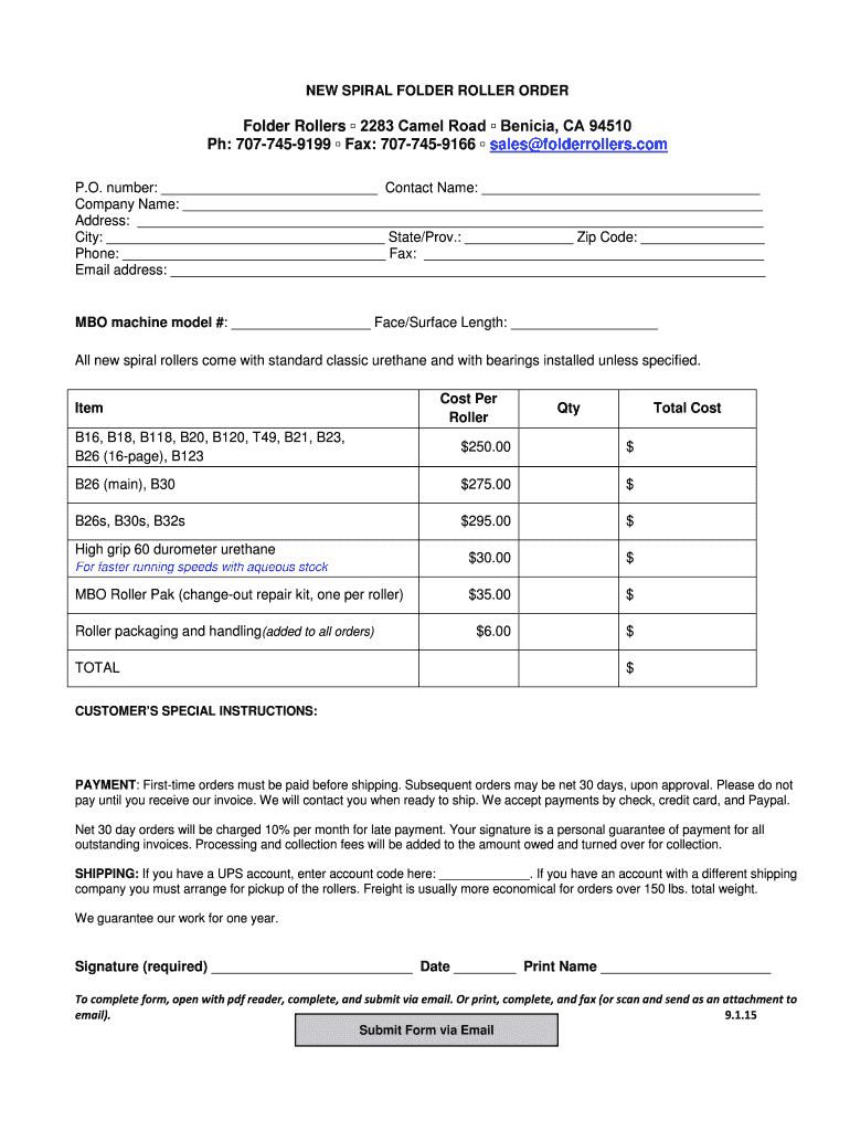 NEW SPIRAL FOLDER ROLLER ORDER Folder Rollers 2283 Camel Road Benicia, CA 94510 pH: 7077459199 Fax: 7077459166 sales folderrollers.com P.O. number: Contact Name: Company Name: Address: City: State/Prov.: