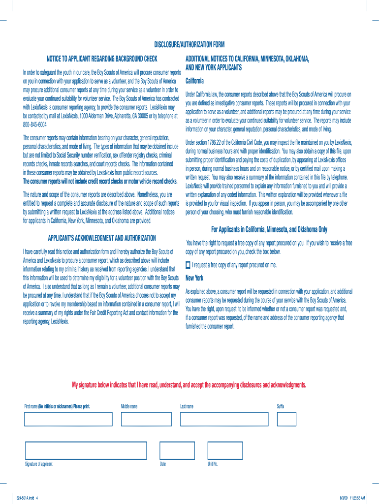 Tips for completing the Application for Adult Membership: ... and the Scout Law, to respect and obey the laws of the United States of ... BSA Privacy Policy. ... This Disclosure/Authorization Form