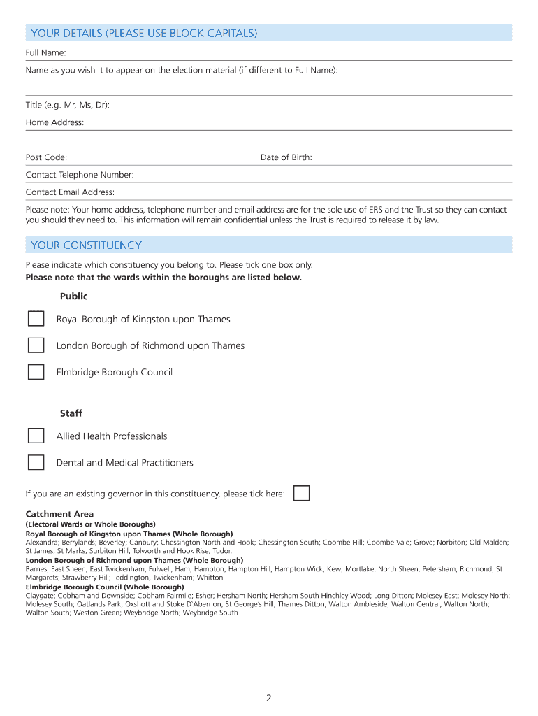 Kingston Hospital NHS Foundation Trust nomination form Election to the Council of Governors 2015 WELCOME The Trust welcomes nominations from persons of any age (16 or over), race, color, religious
