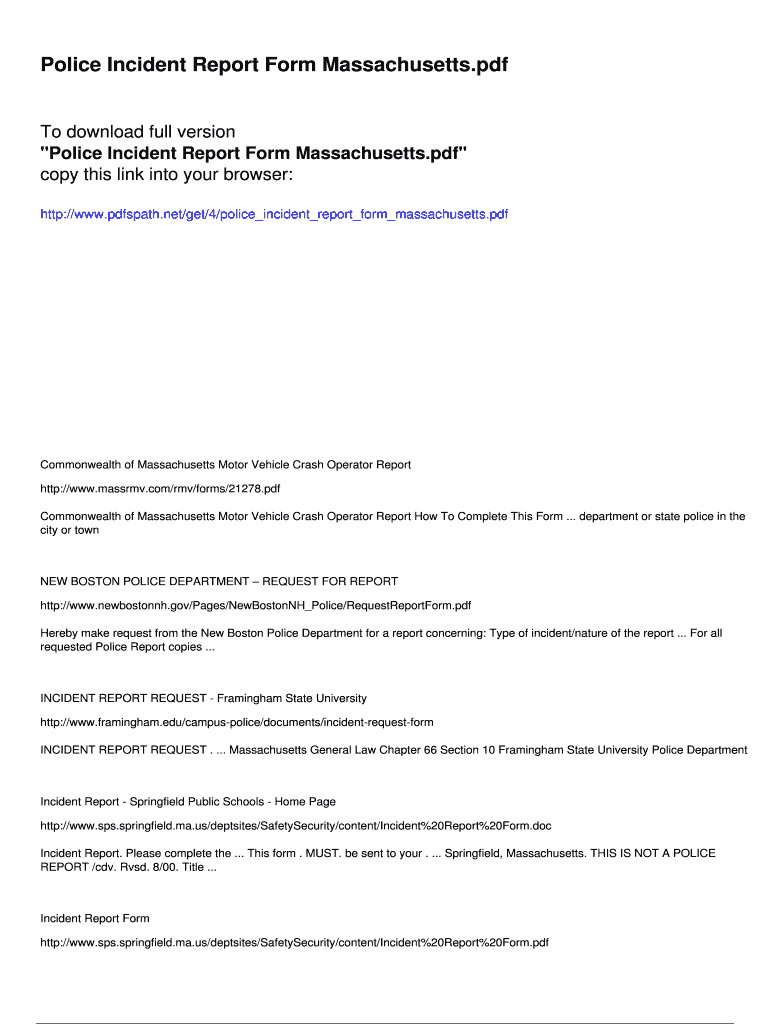 Police Incident Report Form Massachusetts.pdf To download full version “Police Incident Report Form Massachusetts.pdf copy this link into your browser: http://www.pdfspath.net/get/4/police incident
