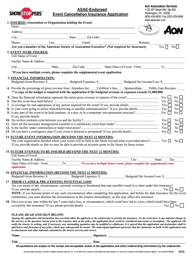 Aon Association Services ASAEEndorsed Event Cancellation Insurance Application 1. INSURED: (Association or Organization holding the Event) Name: 1120 20th Street NW, Ste 600 Washington, DC 20036 (800)