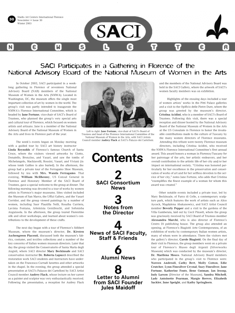 30 Studio Art Centers International Florence Newsletter Issue 30 Winter 2003 SACK Participates in a Gathering in Florence of the National Advisory Board of the National Museum of Women in the Arts