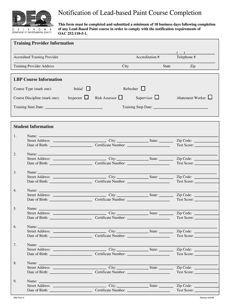 Notification of Lead based Paint Course Completion This form must be completed and submitted a minimum of 10 business days following completion of any Leased Paint course in order to comply with the