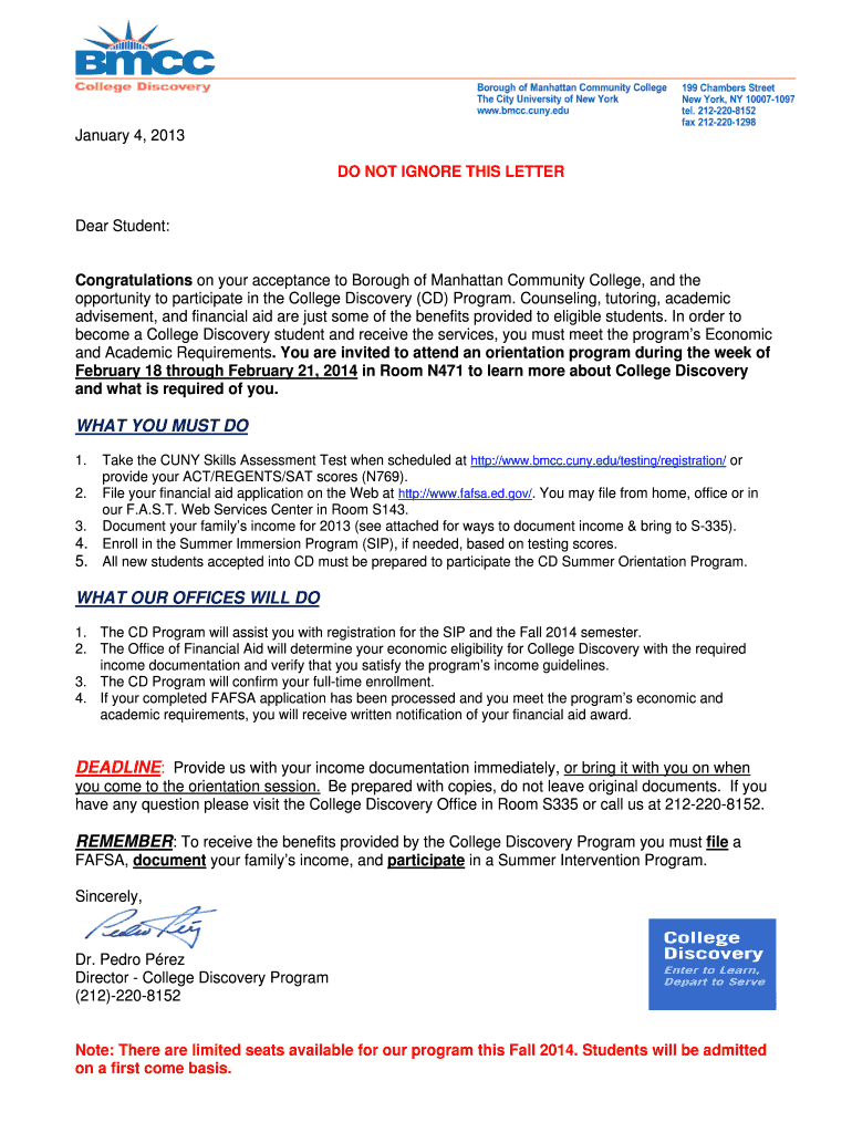 January 4, 2013, DO NOT IGNORE THIS LETTER Dear Student: Congratulations on your acceptance to Borough of Manhattan Community College, and the opportunity to participate in the College Discovery (CD)
