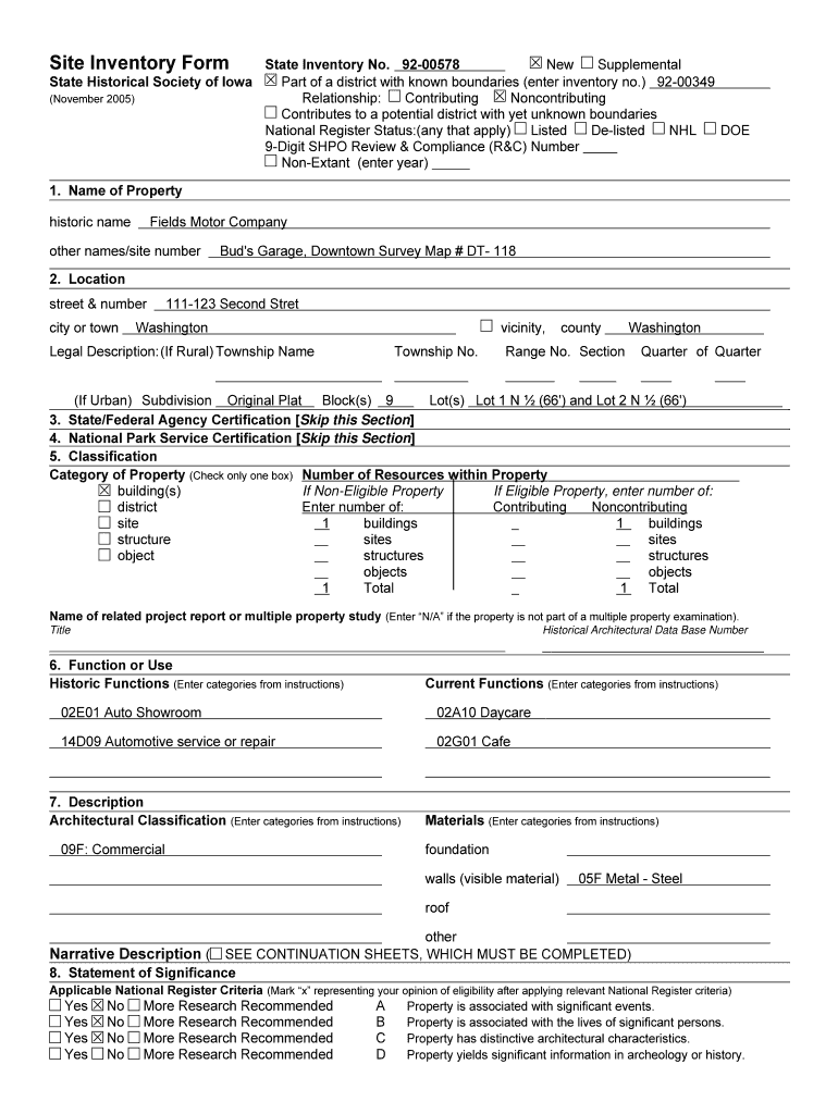 Site Inventory Form State Historical Society of Iowa (November 2005) State Inventory No. 92-00578 New Supplemental Part of a district with known boundaries (enter inventory no.) 92-00349 Relationship: