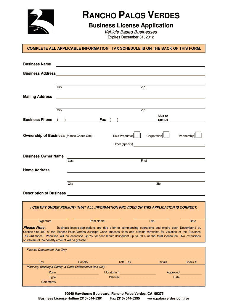 This document serves as an application for a business license for vehicle-based businesses in Rancho Palos Verdes, outlining the necessary information, tax schedules, and penalties for non-compliance.