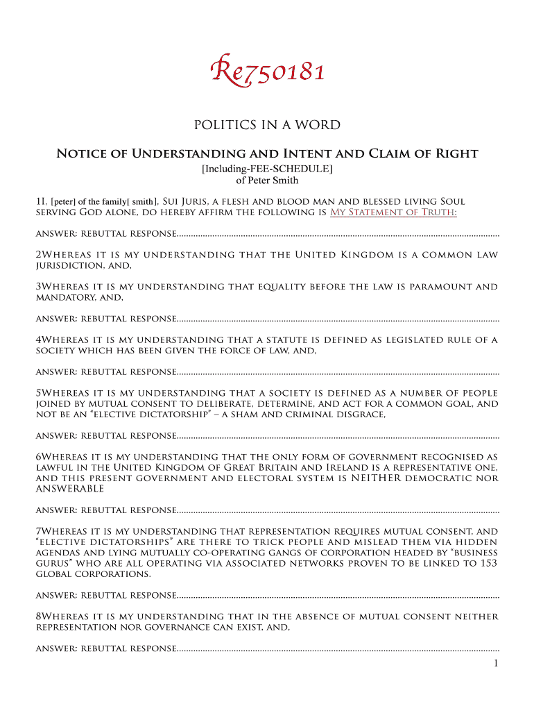 Re750181 POLITICS IN A WORD Notice of Understanding and Intent and Claim of Right IncludingFEESCHEDULE of Peter Smith 1I, peter of the family smith, Sui Juries, a flesh and blood man and blessed living