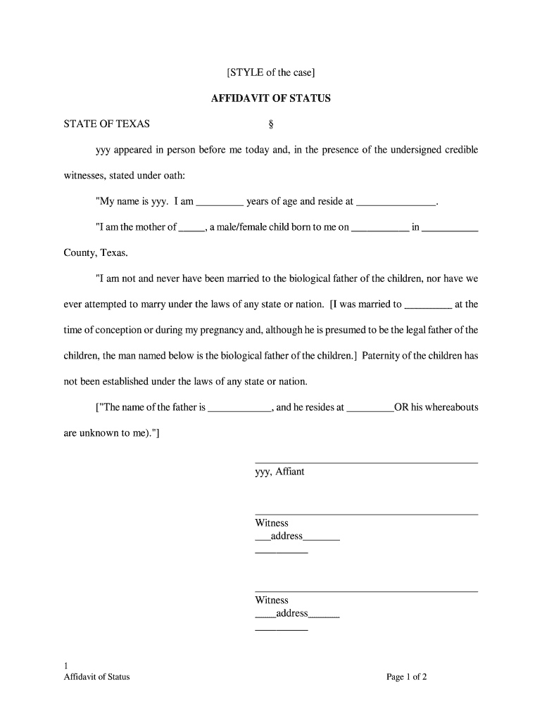 STYLE of the case AFFIDAVIT OF STATUS STATE OF TEXAS YYY appeared in person before me today and, in the presence of the undersigned credible witnesses, stated under oath: “My name is YYY. I am years