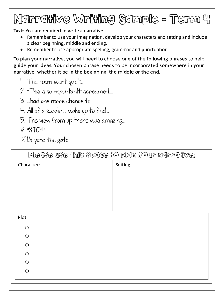 Narrative Writing Sample Term 4 Task: You are required to write a narrative Remember to use your imagination, develop your characters and setting and include a clear beginning, middle and ending.