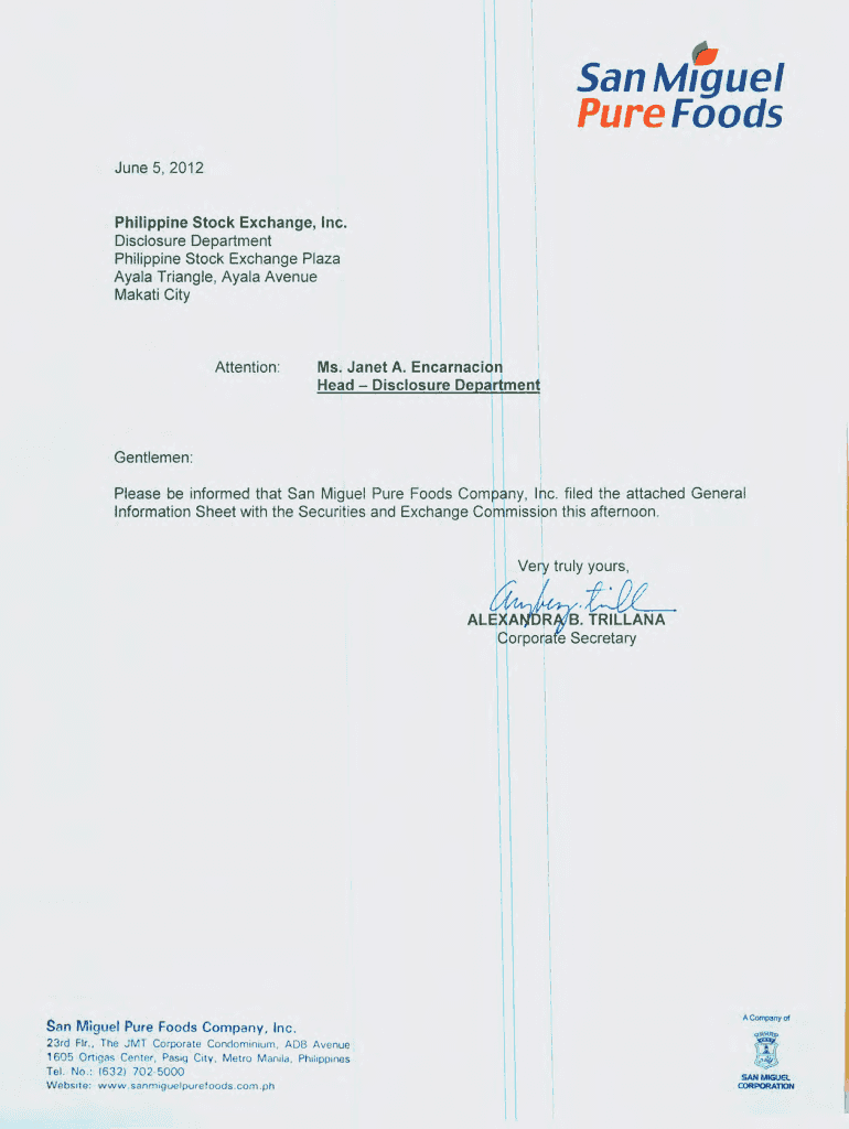 Get the free * SanMlguel Pure Foods June 5,2012 Philippine Stock Exchange, Inc