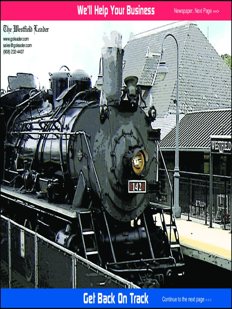 Well Help Your BusinessNewspaper, Next Page The Westfield Leader www.goleader.com sales×goleader.com (908) 2324407Get Back On TrackContinue to the next page Ad Populous, Non Adieus, Parvenus OUR