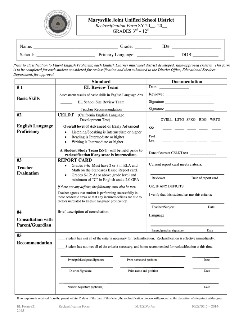 Marysville Joint Unified School District Reclassification Form SY 20 20 GRADES 3rd 12th Name: Grade: ID# School: Primary Language: DOB: Prior to classification to Fluent English Proficient, each English