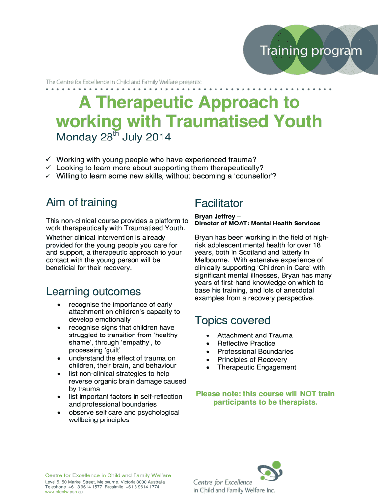 A Therapeutic Approach to working with Traumatized Youth Monday 28th July 2014 Working with young people who have experienced trauma? Looking to learn more about supporting them therapeutically? Willing