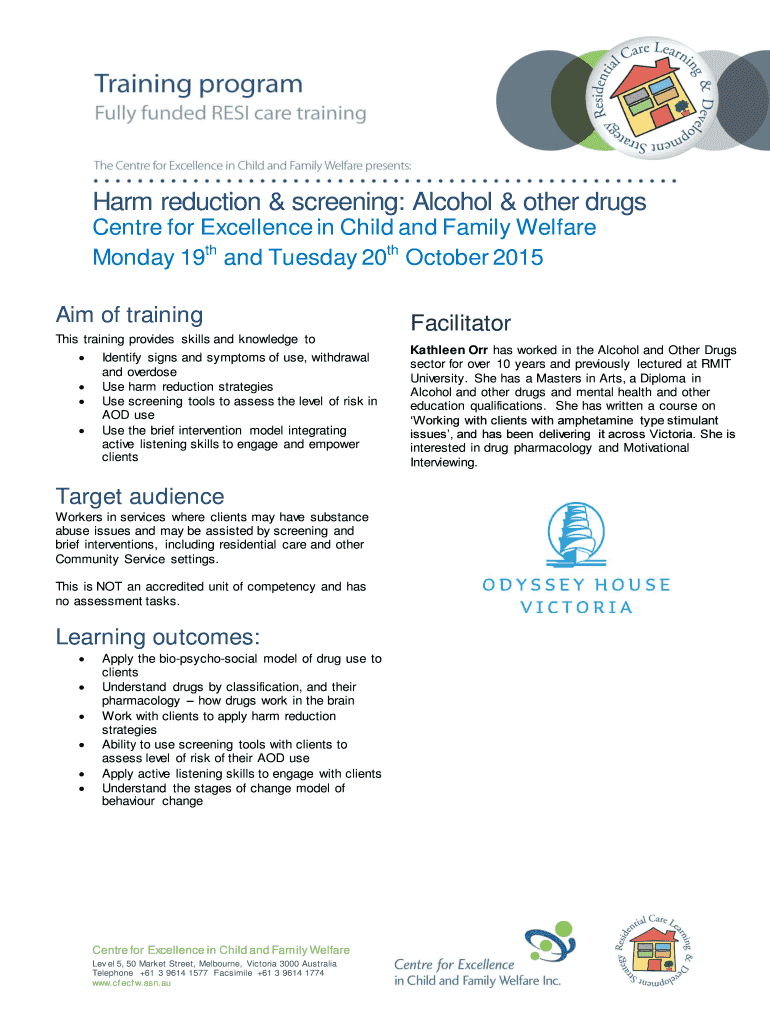 Harm reduction & screening: Alcohol & other drugs Center for Excellence in Child and Family Welfare Monday 19th and Tuesday 20th October 2015 Aim of training This training provides skills and knowledge
