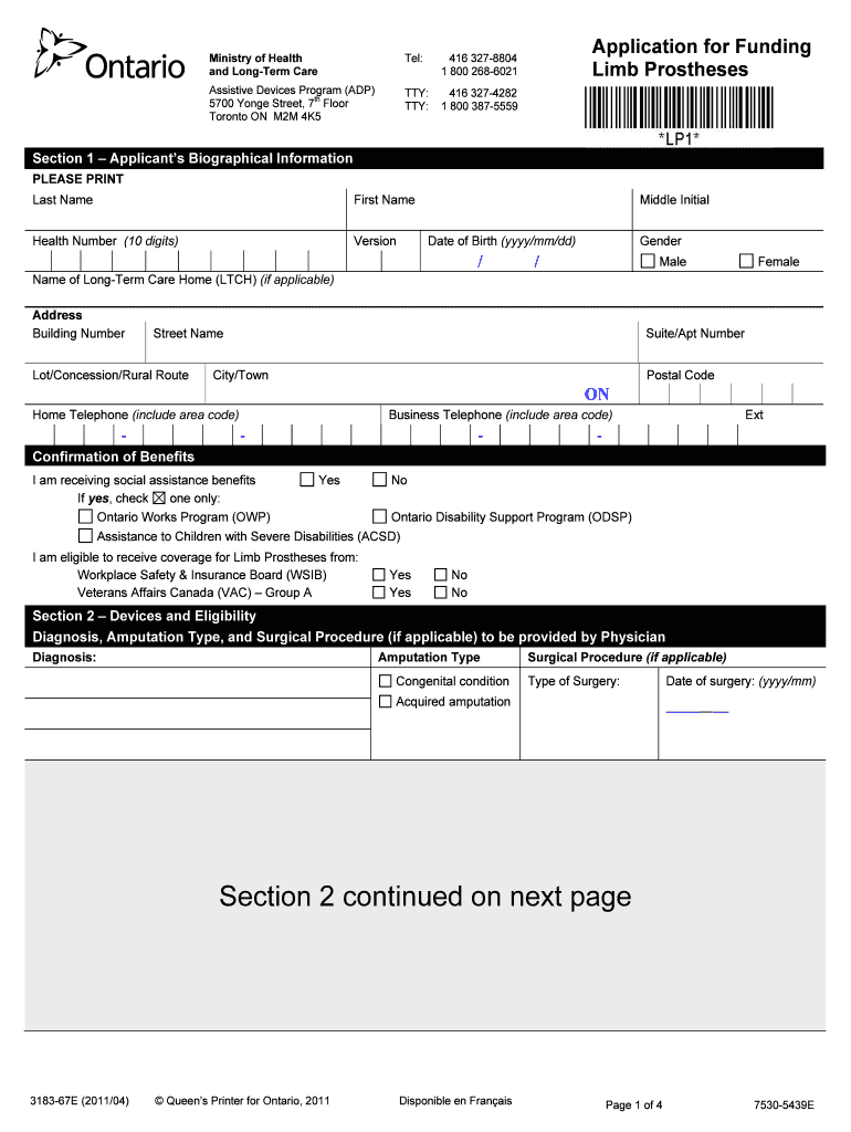 Ministry of Health and Longer Care Clear Form Tel: Assistive Devices Program (ADP) TH 5700 Yong Street, 7 Floor Toronto ON M2M 4K5 TTY: TTY: Application for Funding Limb Prostheses 416 3278804 1 800