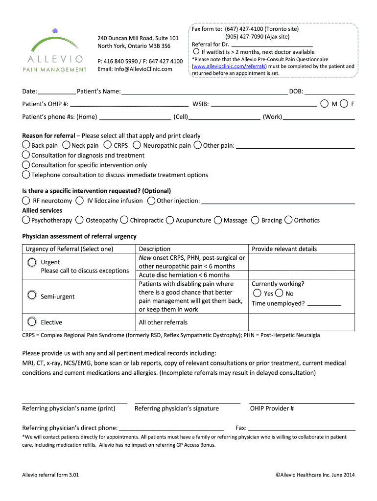 240 Duncan Mill Road, Suite 101 North York, Ontario M3B 3S6 P: 416 840 5990 / F: 647 427 4100 Email: Info AllevioClinic.com Date: Fax form to: (647) 4274100 (Toronto site) (905) 4277090 (Ajax site)
