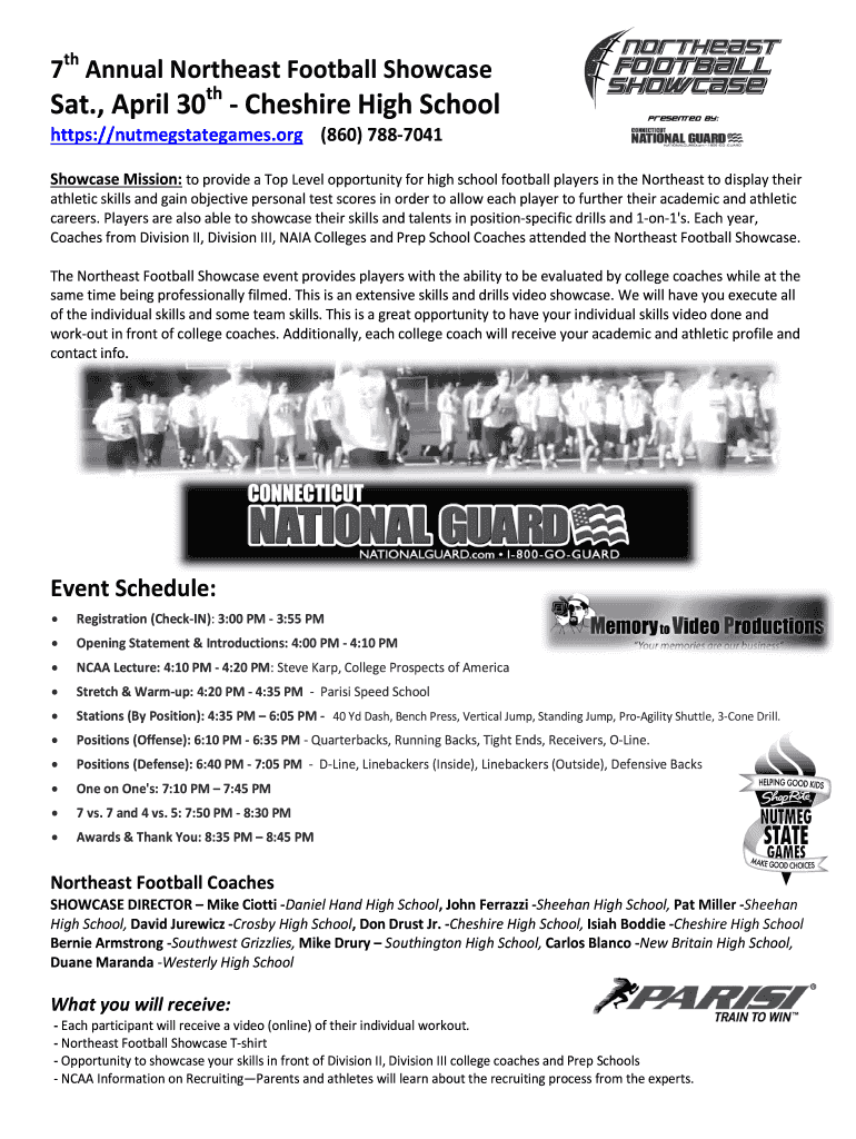 7th Annual Northeast Football Showcase Sat., April 30th Cheshire High School https://nutmegstategames.org (860) 7887041 Showcase Mission: to provide a Top Level opportunity for high school football