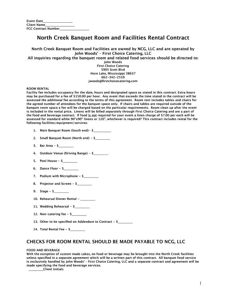 Event Date Client Name FCC Contract Number North Creek Banquet Room and Facilities Rental Contract North Creek Banquet Room and Facilities are owned by NGC, LLC and are operated by John Woods First