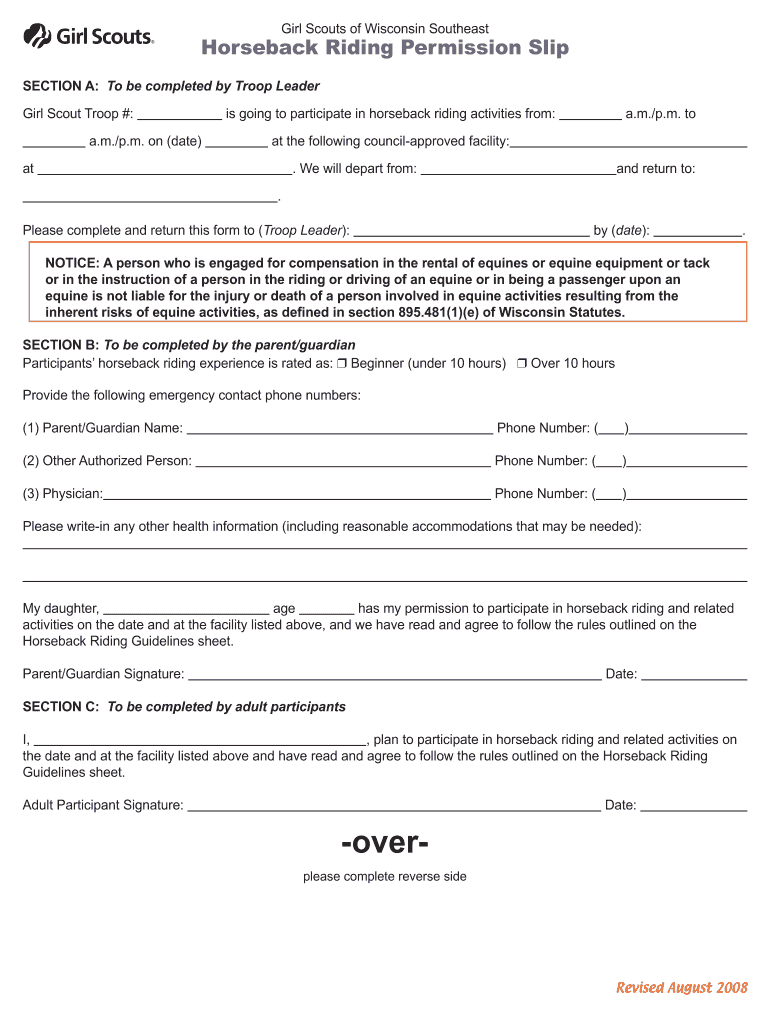 Girl Scouts of Wisconsin Southeast Horseback Riding Permission Slip SECTION A: To be completed by Troop Leader Girl Scout Troop #: a.m./p.m. on (date) is going to participate in horseback riding activities